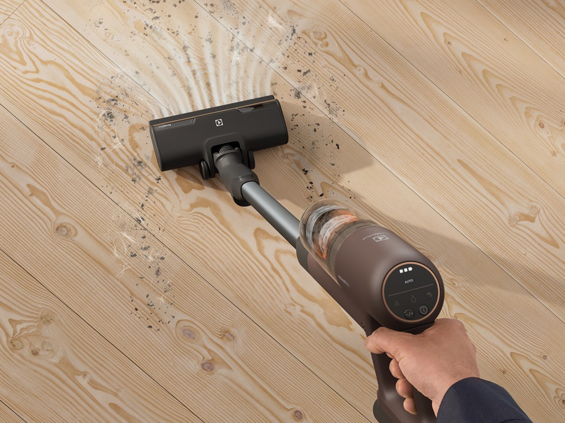 En kvinde støvsuger jord op fra gulvet med en Electrolux ledningsfri støvsuger.