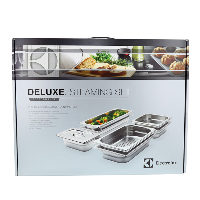 Electrolux 8 stk. dampsæt i rustfrit stål til ovne med fuld damp. Dampning af mad er en sund og hurtig tilberedningsmetode, der bringer den ultimative smag og tekstur frem i ingredienserne. Indeholder 1 perforeret & 1 ikke-perforeret fad 16x17 cm, 1 perforeret & 1 ikke-perforeret fad 16x26 cm, 1 perforeret & 1 ikke-perforeret fad 13x32 cm og 1 ikke-perforeret fad 11x17 cm m/ låg.