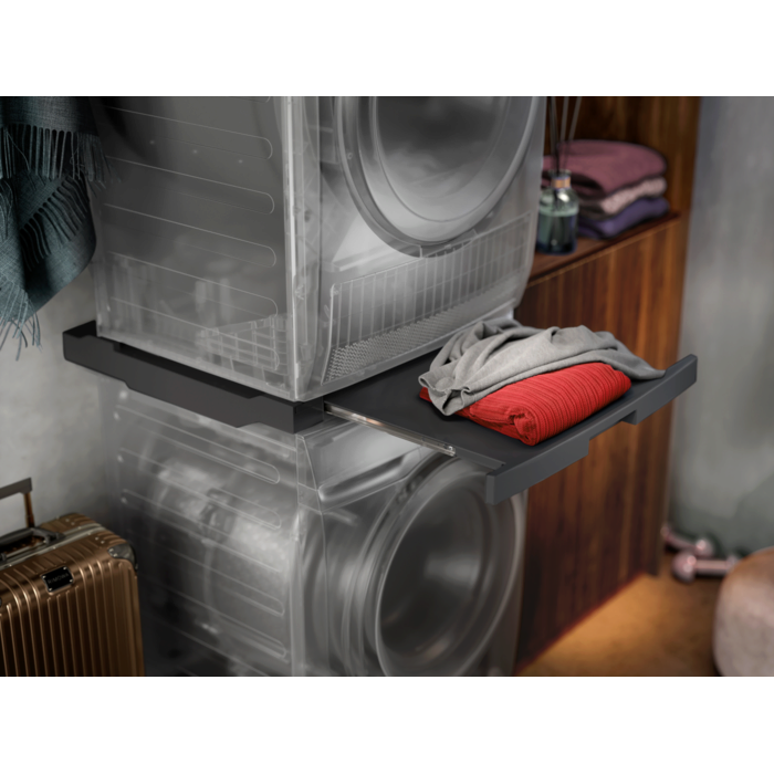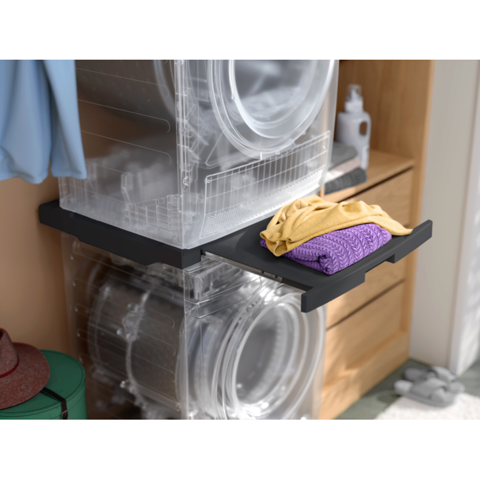 Designet med mere plads i tankerne. Med vores sammenbygningsbeslag kan du nemt installere din tørretumbler oven på vaskemaskinen. Og en indbygget udtrækshylde gør den nem at bruge. Velegnet til alle frontbetjente vaskemaskiner og tørretumblere med en dybde fra 52 til 67 cm