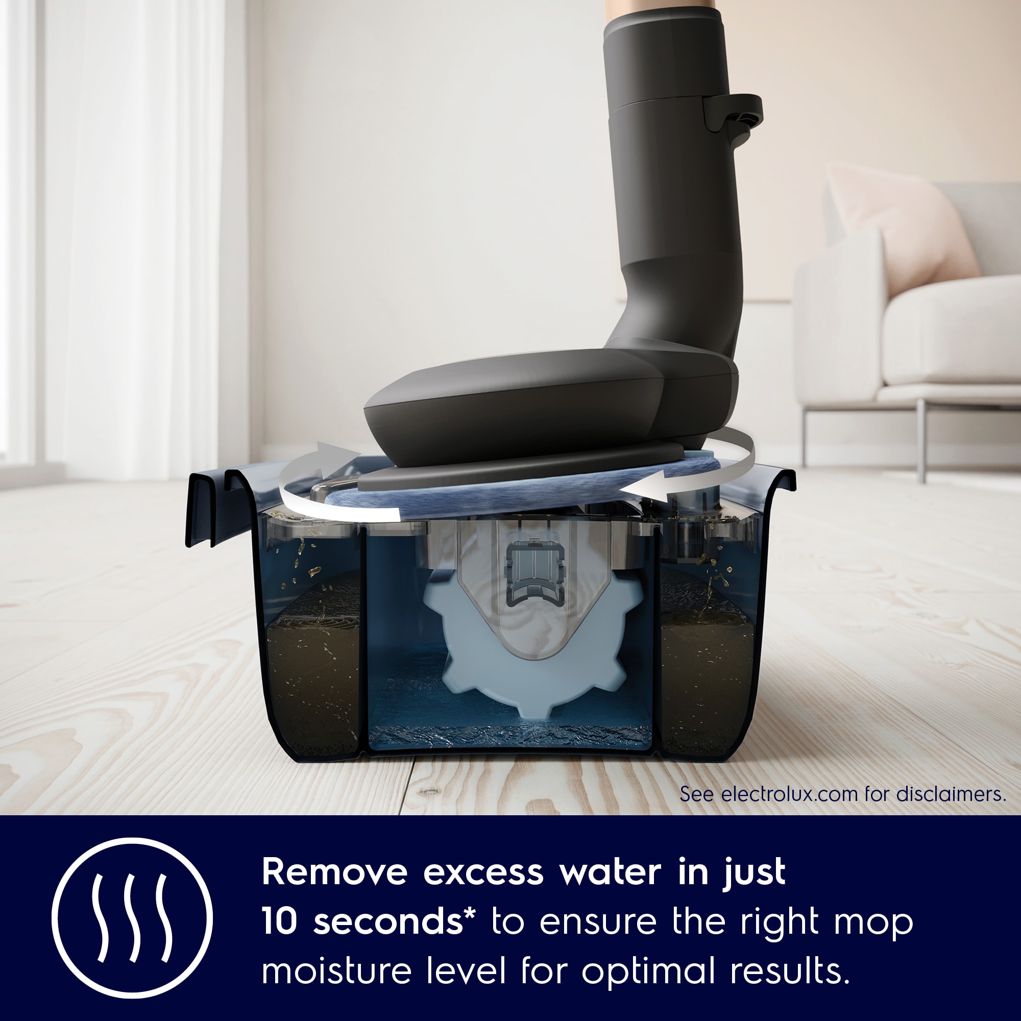 *Fem sekunder er den skylletid, der anbefales, for effektivt at fjerne husholdningssnavs fra moppepuderne. Baseret på interne tests hos Electrolux.