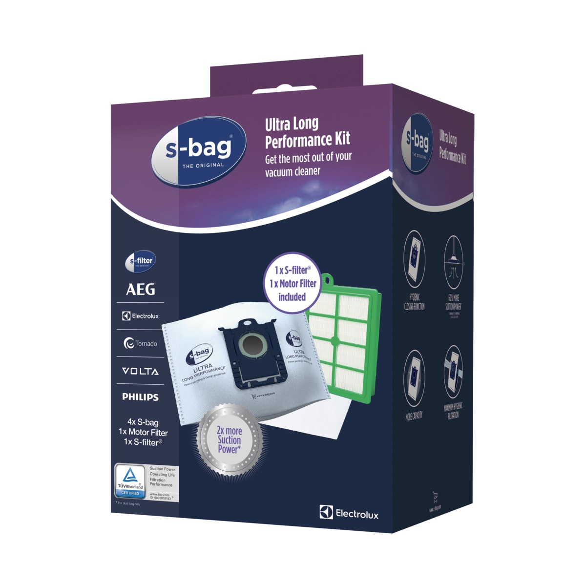 Performance Kit. Indeholder: 1 x EFH12 s-filter® Hygiene, ikke-vaskbart. 4 x s-bag Ultra long performange, 1 x motorfilter EF1. Passer til: støvsugere m/pose fra 600 serien og derover