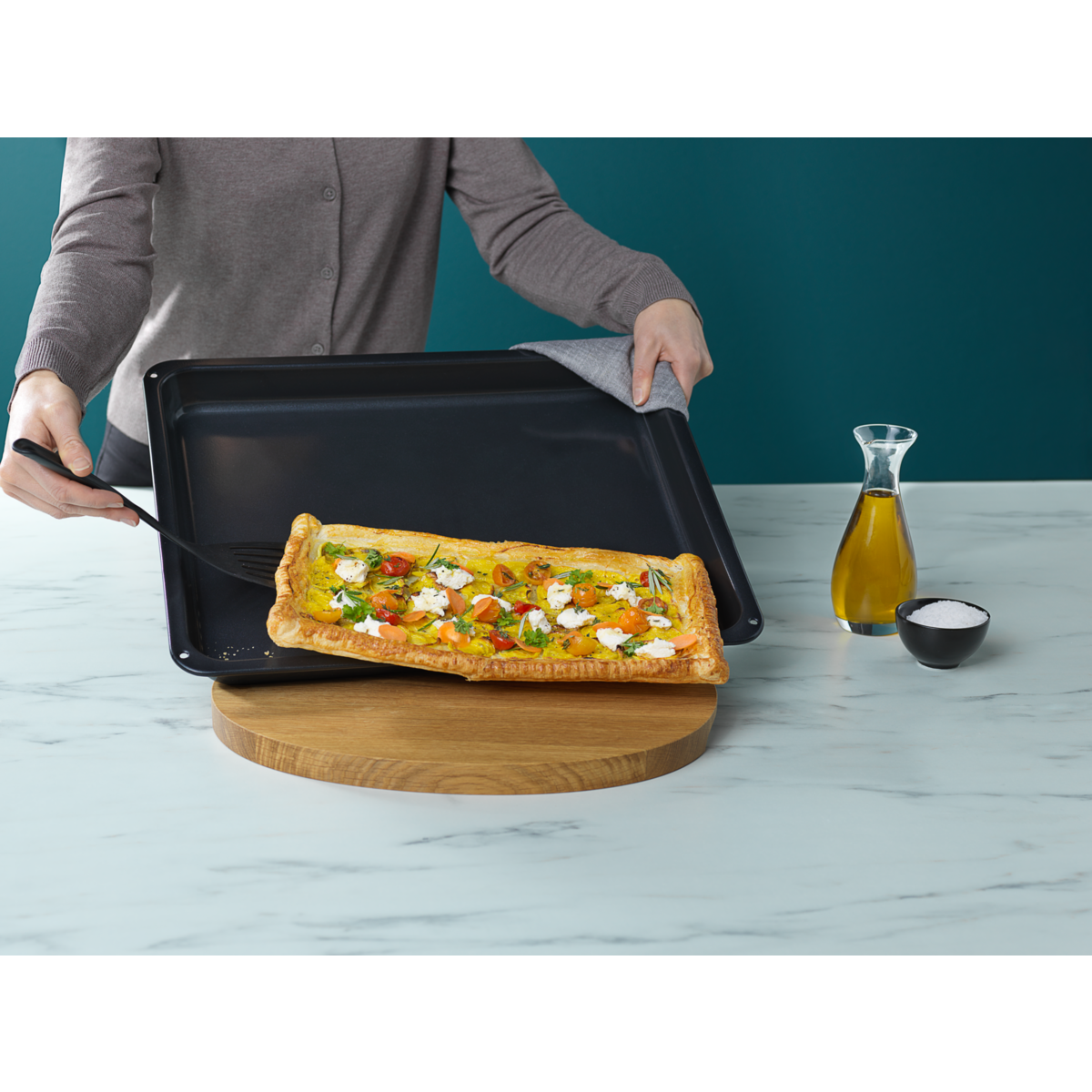 Det bedste fra begge verdener. Placer maden direkte på Easy2Clean bradepanden. Dens keramiske belægning forhindrer mad i at sætte sig fast på pladen, hvilket eliminerer behovet for bagepapir eller ekstra oliering. Den er nem at vaske med en våd klud, varmt vand og lidt opvaskemiddel.