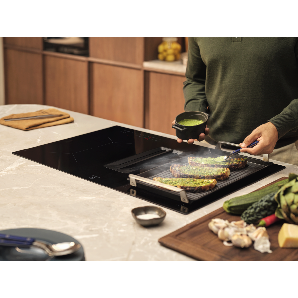 Nyd de mange fordele ved en induktionskogeplade med integreret emhætte, der giver optimal luftstrøm, som passer til et 60 cm skab. 600 Bridge kogepladen med integreret emhætte har Bridge funktion, så du kan kombinere to kogezoner til ét større område