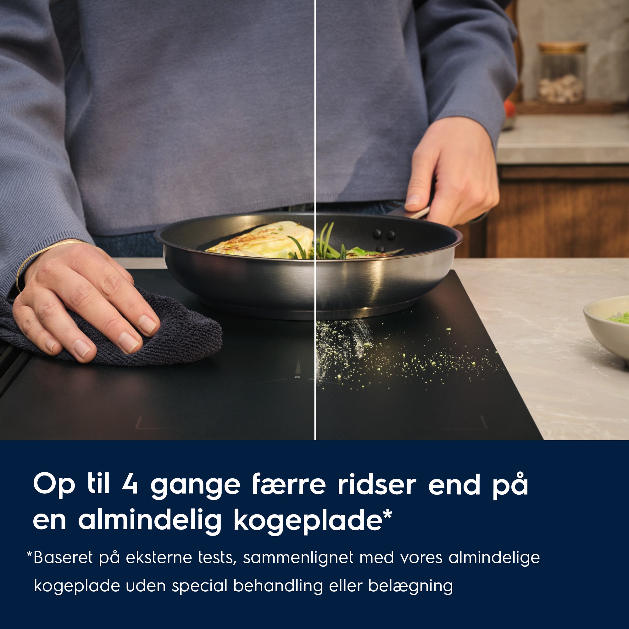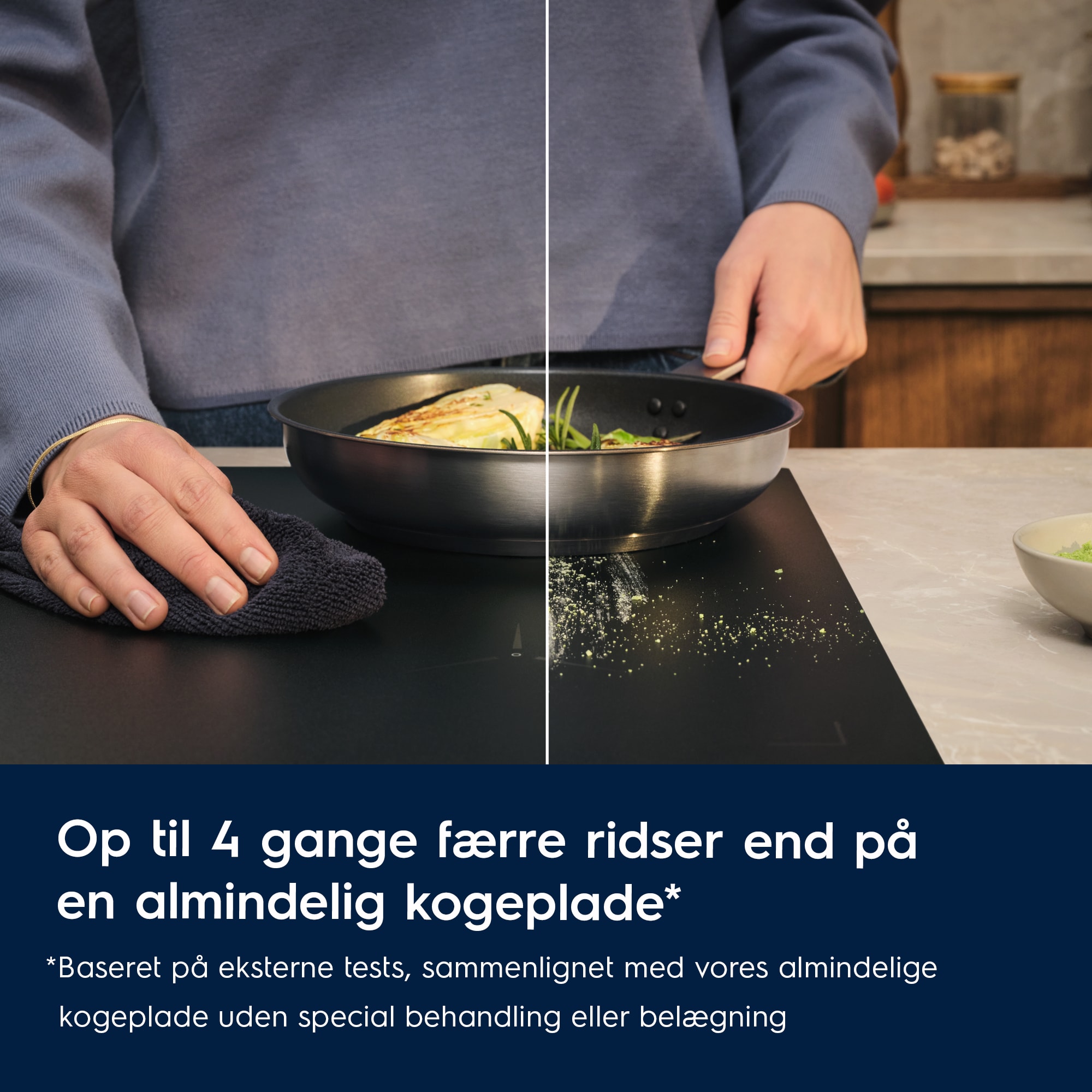 *Baseret på slidtest foretaget af eksternt schweizisk laboratorium i overensstemmelse med den internationale IEC 60068-2-70 standard. Synlighed af ridser vurderes internt og sammenlignes med vores standard keramiske kogeplader uden særlig behandling eller belægning.