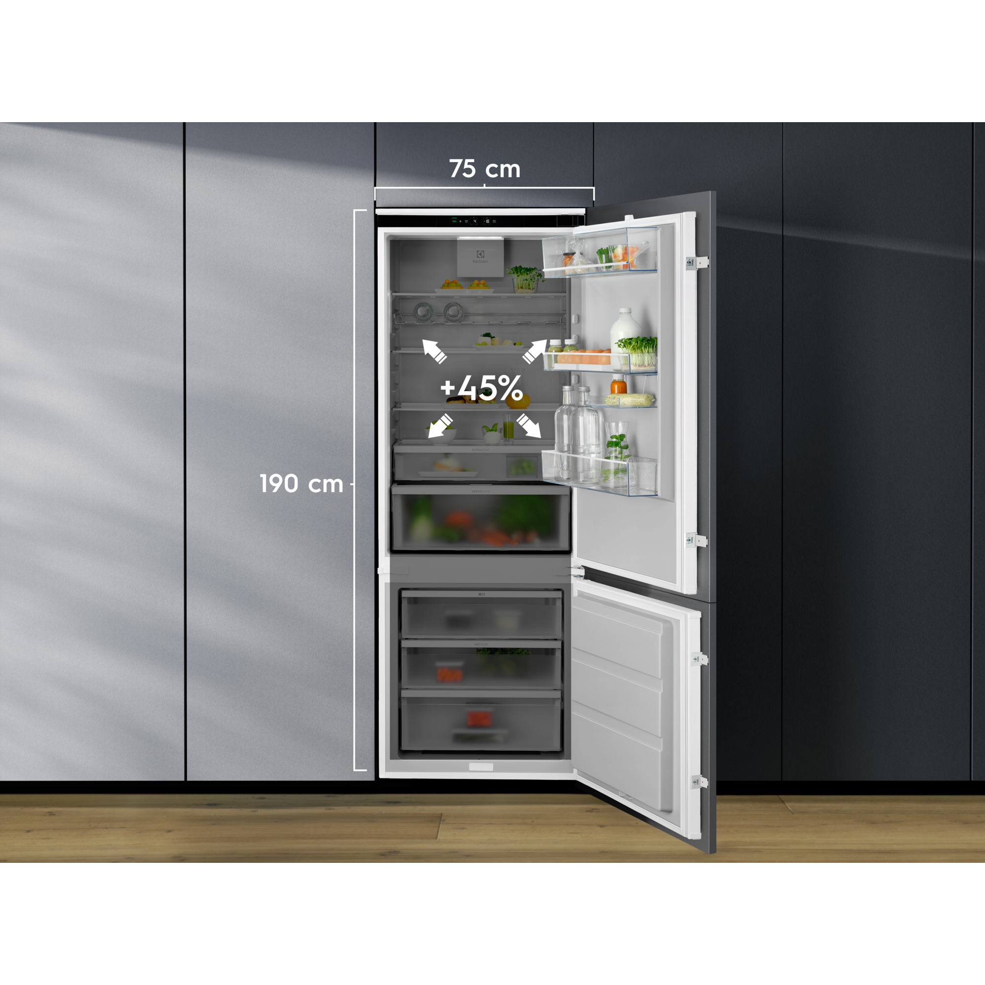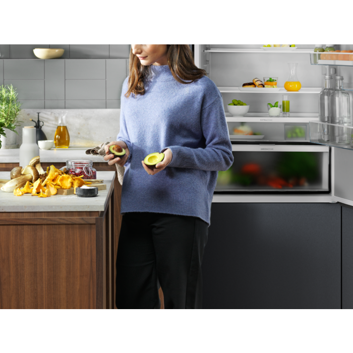 700 GreenZone køle-/fryseskabet har en forseglet skuffe, hvor luftfugtigheden holdes på et ideelt niveau ved at håndtere overskydende kondens, hvilket hjælper med at forhindre at fødevarerne fordærves. Dette bevarer op til 95% af vitaminerne ved at beskytte varerne med den rette mængde fugt.