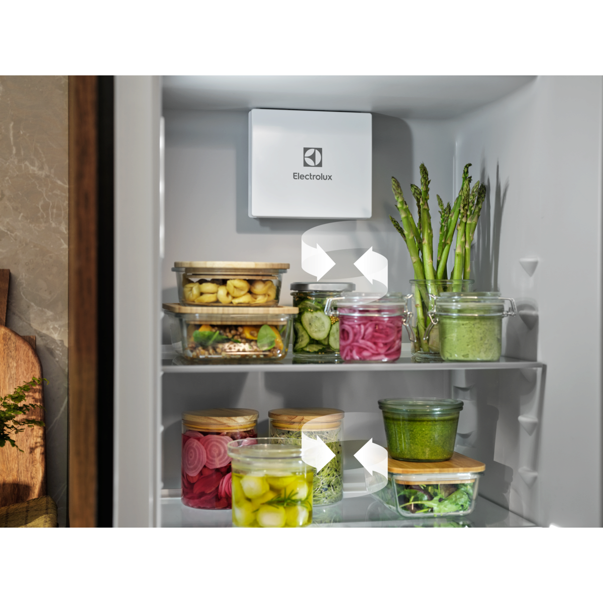 DynamicAir Technology skaber en luftstrøm, der flytter kølig luft rundt i køleskabet, så der altid er en stabil temperatur helt ud i hjørnerne. Bevarer ingredienser fra at miste form eller tørre ud.