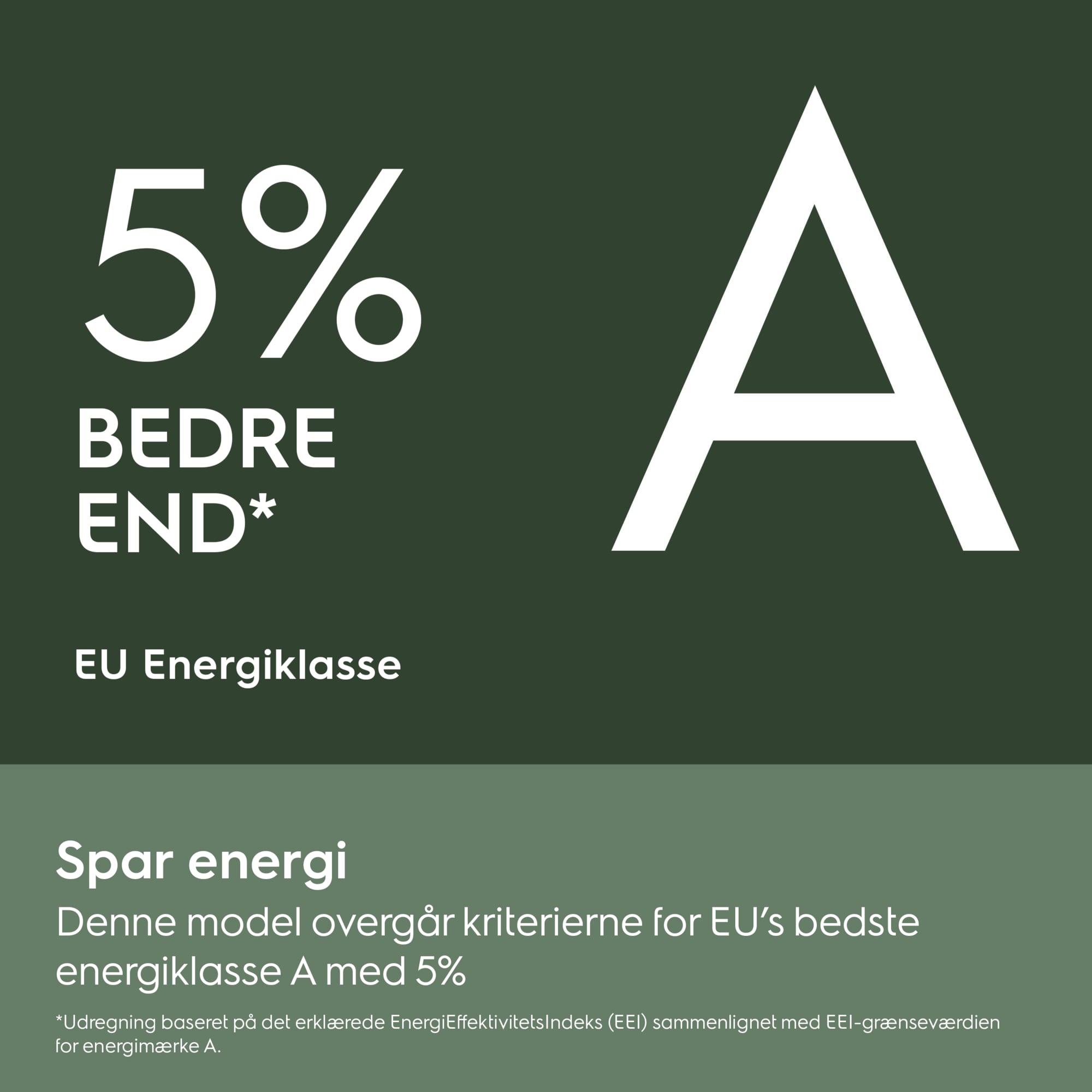 *Baseret på intern test af tids-, vand- og energiforbrug for en mængde på 1 kg sammenlignet med en maks. mængde ved tørring af bomuld med SensiCare+, som justerer tørreprogrammet efter mængden.