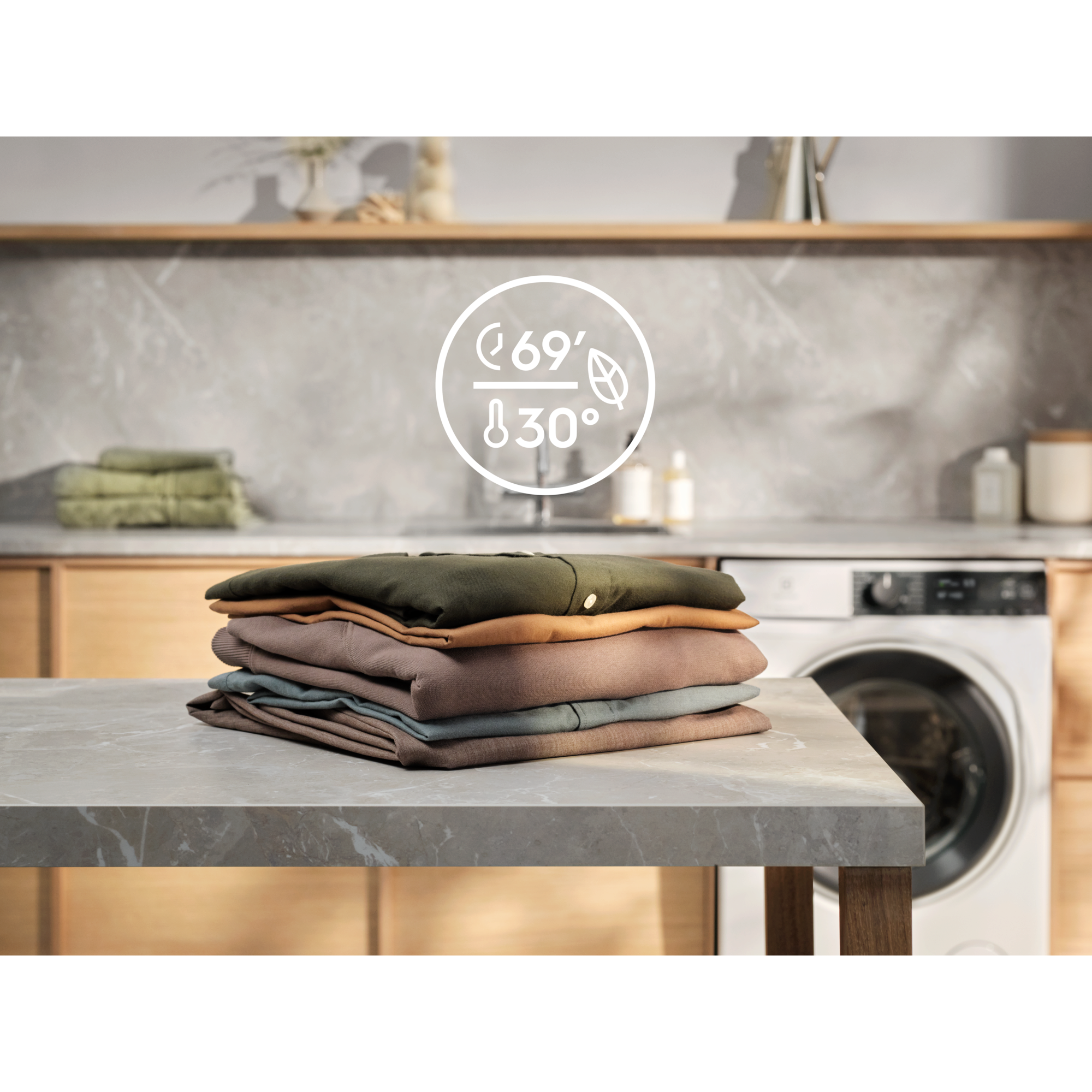 *Baseret på intern test af tids-, vand- og energiforbrug for en tøjmængde på 1 kg sammenlignet med maks. tøjmængde for en bomuldsvask ved 30°C med SensiCare+, som justerer programmet efter tøjmængden.