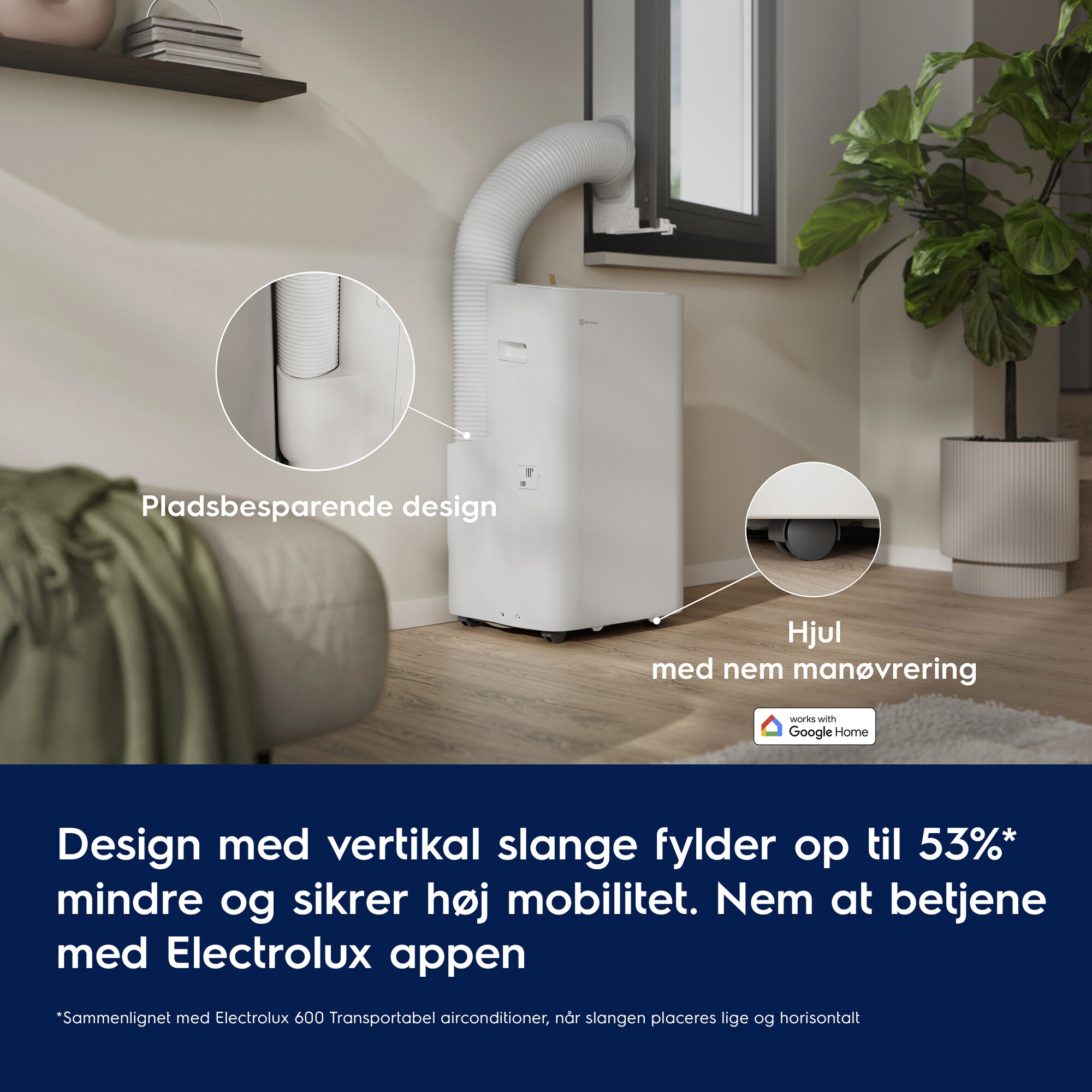 ¹Sammenlignet med transportabelt Electrolux 600 aircondition anlæg, når slangen placeres horisontalt. ²Aircondition anlægget er fremstillet med 8% genanvendte materialer af den samlede produktvægt, eksklusiv emballage, fremstillet af genanvendt plastik.