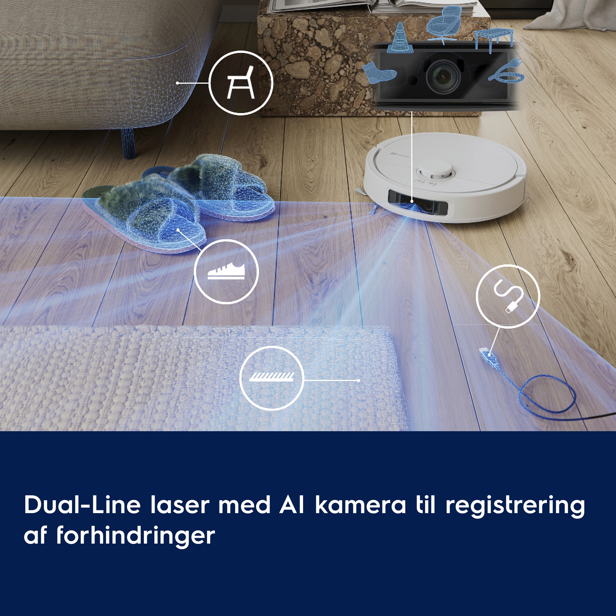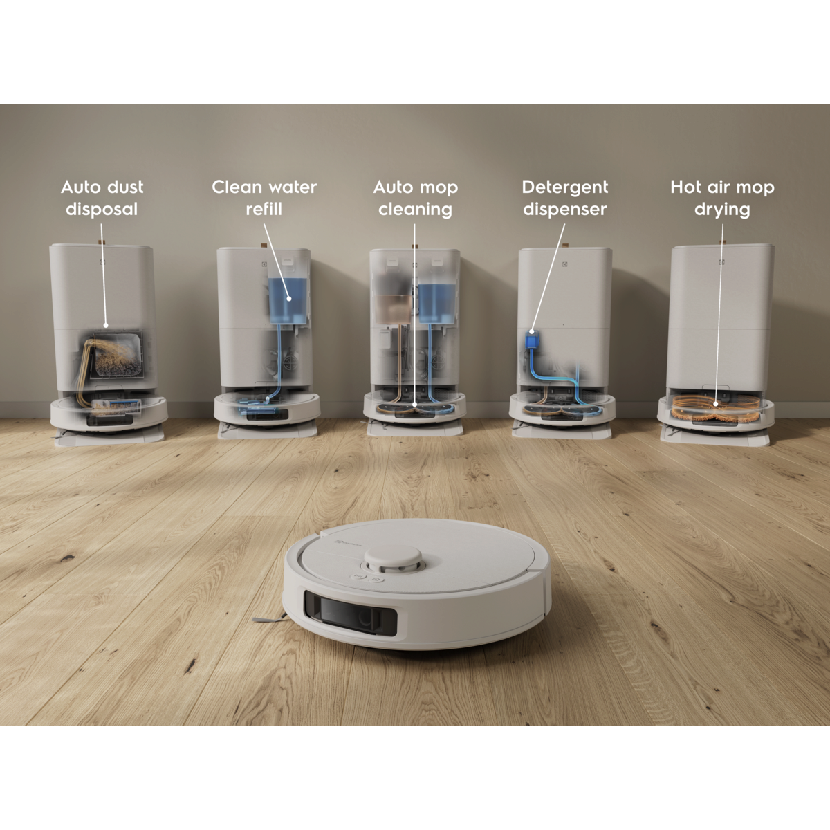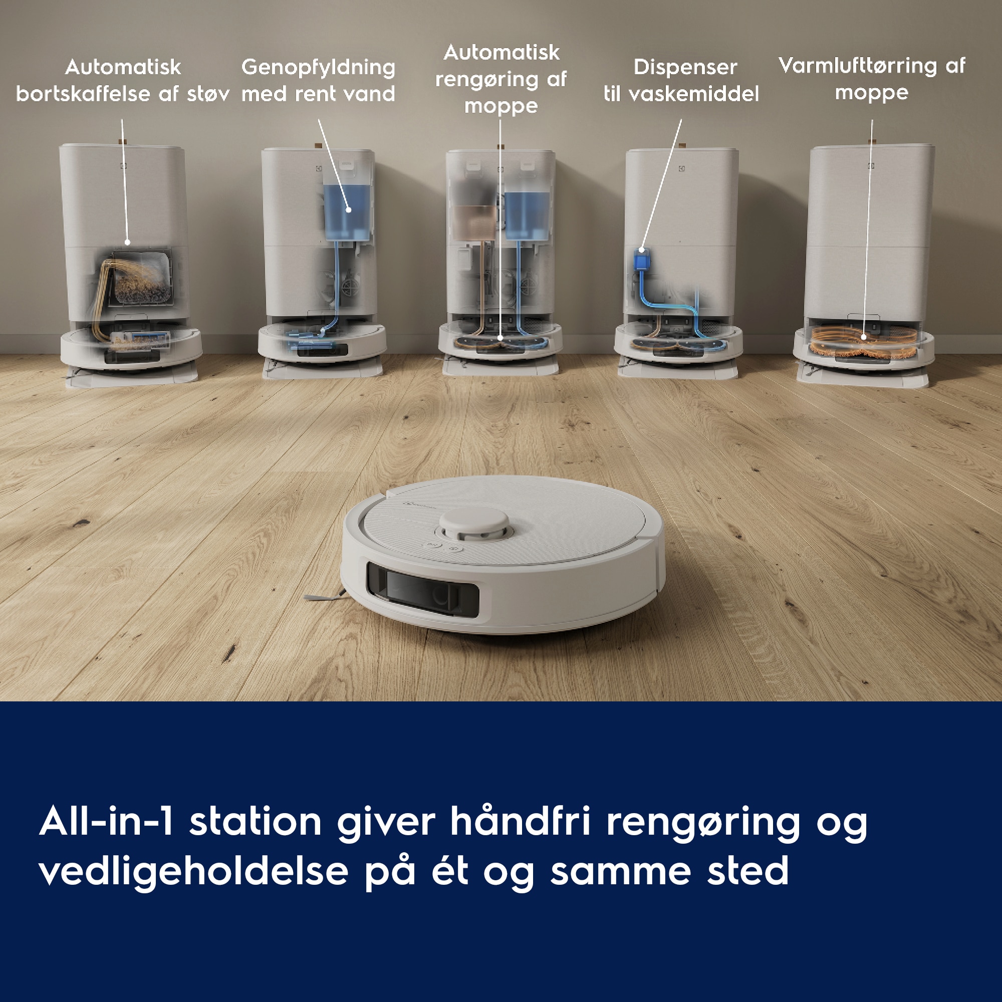 Glem alt om støvsugning og gulvvask. 800 Robotstøvsugeren med alt-i-én station klarer rengøringen, selv når du væk hjemmefra. Bare indstil robotstøvsugeren og fortsæt med din dag, mens den nemt og ubesværet navigerer rundt om møbler, rengør gulvtæpper, vasker gulvet og fjerner snavs.