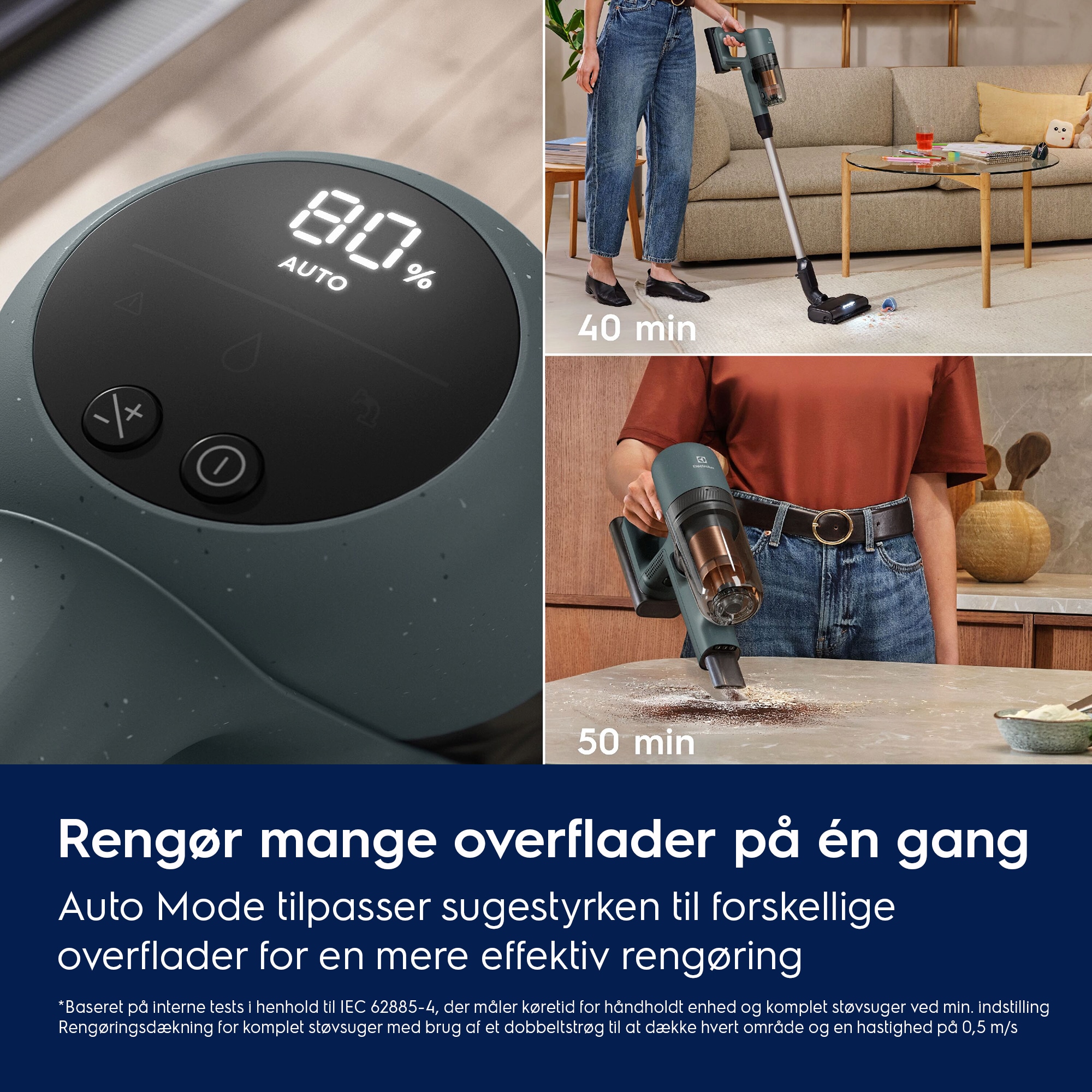*Baseret på intern test på hårde gulve med brug af Boost tilstand ifølge IEC 62885-4 standarden.